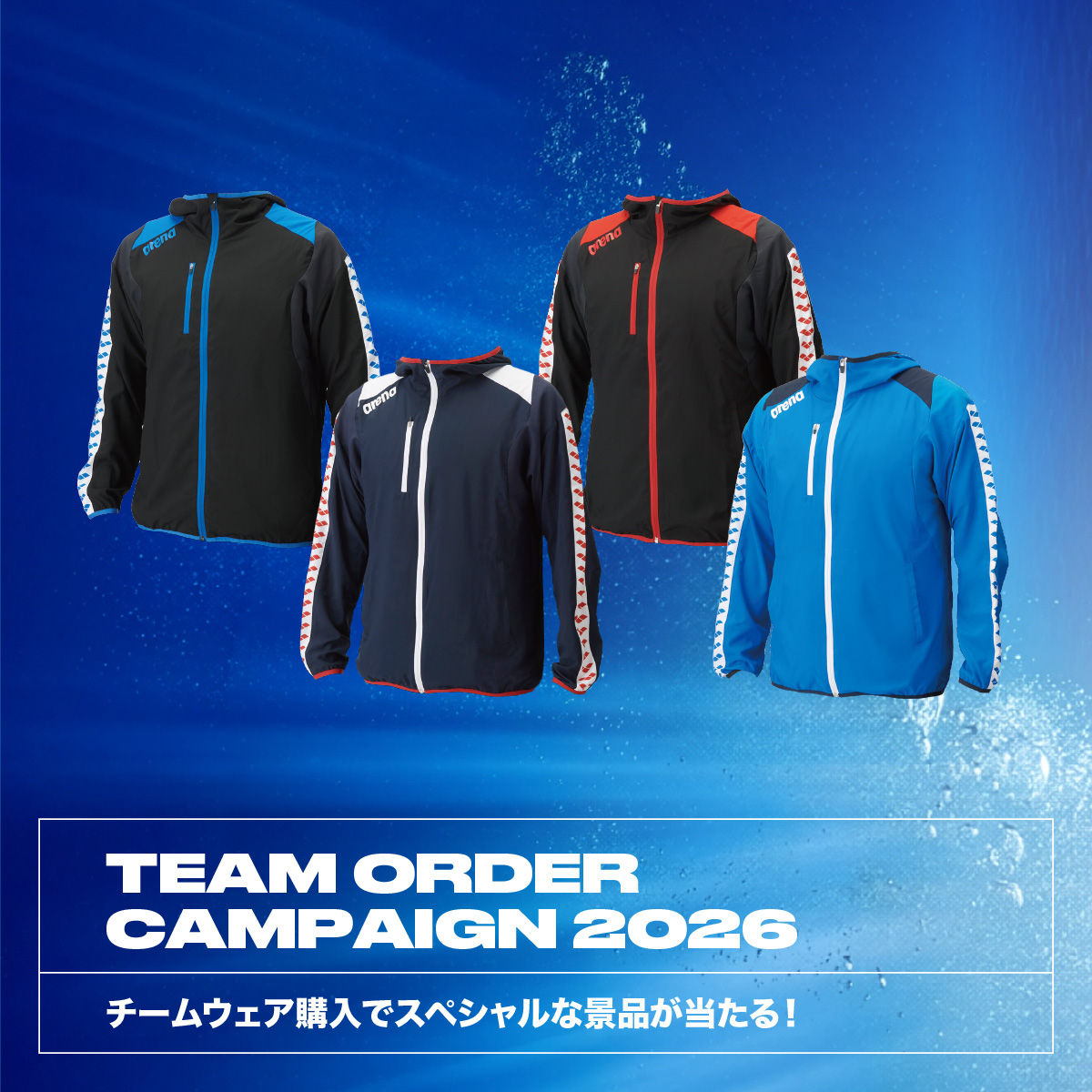 | 【特賞/A賞】応募条件 | ・応募期間中に対象商品のアリーナ チームウインドブレーカー上下(ジャケット・ロングパンツ)を4セット以上購入し、購入レシートを持っている方 ・所属チームの代表者に応募の旨を許可いただいた方 ・応募者及び、所属チーム代表者の両方が下記<個人情報のお取り扱い>に同意いただけるチーム <個人情報のお取り扱い> 当社は、ご提供いただいたお客様の個人情報を「個人情報保護方針」の定め(個人情報の利用目的を含みます)に従って適切に取り扱うとともに、その他以下に記載する利用目的に利用いたします。 (1)本キャンペーンの運営・実施・管理 (2)商品発送のほか、本キャンペーンに関するお客様対応 |