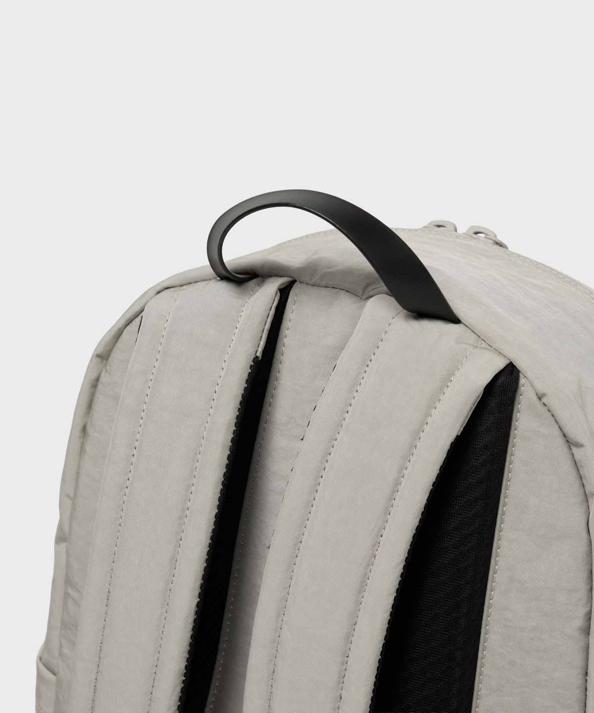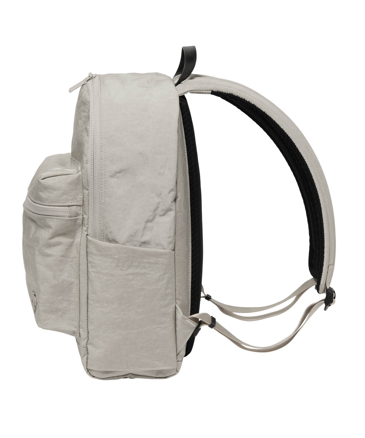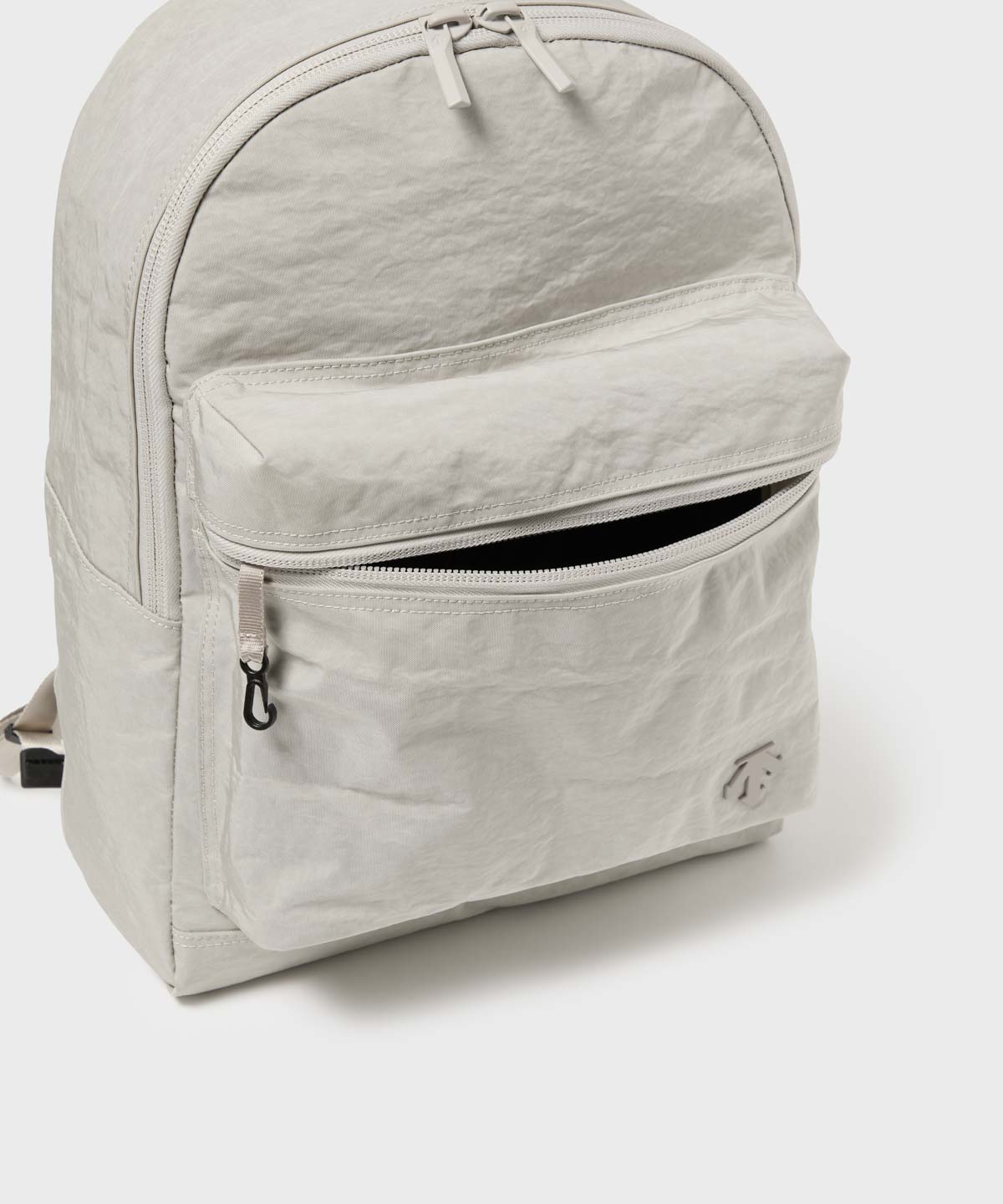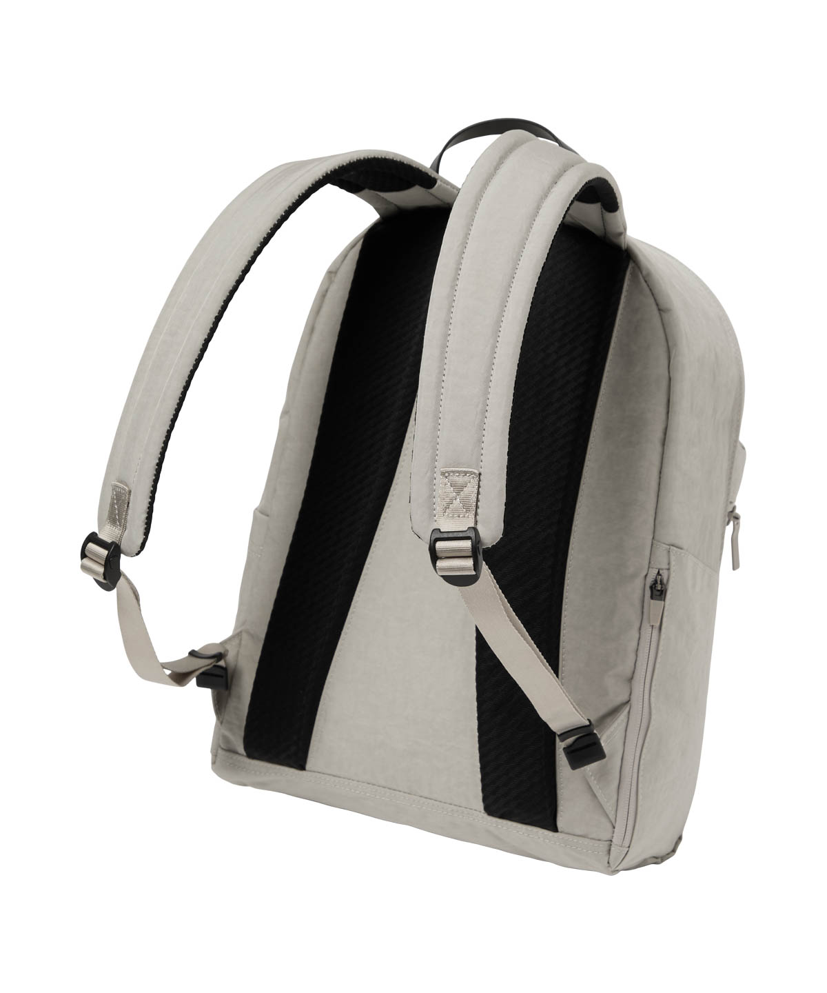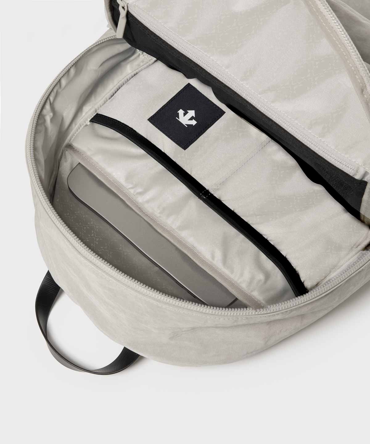 背面は立体的なクッションを配し、背中の汗をかきやすい部分を凹ませたデザインにすることで通気を促し、快適な背負い心地になる設計。ショルダーハーネスは体に沿うこだわりのオリジナルパターンを採用することで、快適な背負い心地を追求。メインルーム内にはクッション入りのPCスリーブや3つの小分けポケット、正面ルーム内には2つの小分けポケットと キーフック、本体右側にはボトルホルダー、左側には背負ったままでも使用しやすい縦型のファスナーポケットがあるなど、充実の収納力。トップには握りやすいTPU素材のハンドルを採用。抗菌防臭加工を施した裏地はオリジナルロゴ入り。