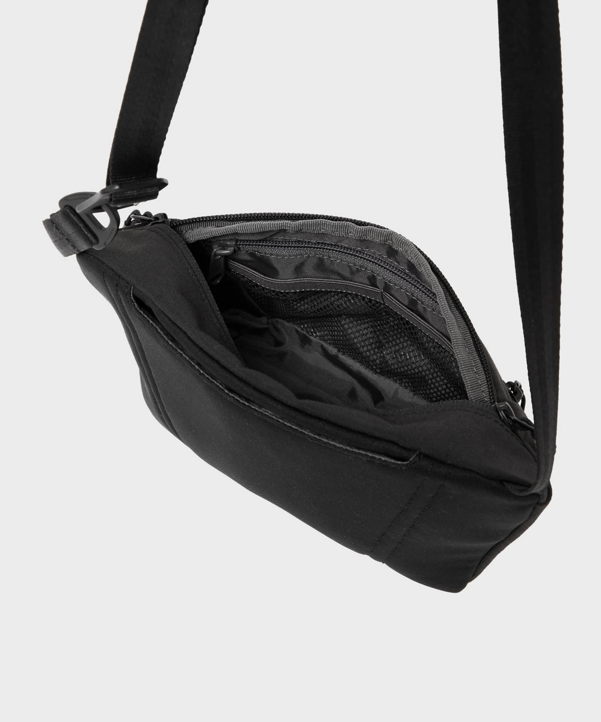 軽量で耐久性の高いアルミ製のテンションフックでベルトのサイズ調整が可能で、ベルトを長くすればスリングバッグとしても使用可能。フックを外せば上着の下にバッグを着用していても簡単に脱着が可能。