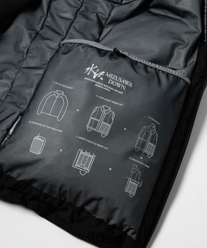 あらゆるディテールを製品の内側に潜め、よりミニマルなデザインを実現。表地は軽量性に秀でた30d 4WAY STRETCH MICRO RIPSTOPを採用。さらに生地裏側には断熱性を高める特殊プリントを施すことで、ダウン量を従来モデルの約60%に抑えた軽やかな着心地ながら、確かな保温性と着用快適性を実現。中生地には光を熱へと変換し積極的な保温性能を発揮するHEAT NAVI®を採用。内側には大容量ポケットを備え、ポケッタブル携行も可能。また、衿部分にはフードを内蔵し、急な天候変化時にも対応可能なスタンドカラーデザイン。内衿には抗菌防臭効果のある素材を使用したDETACHABLE COLLARを搭載し、衿汚れを防ぎ、取り外すことで首周りの空気の出入りも調節可能。さらに「DOWNPASS」 認証を取得したトレーサブルダウンを使用し、全ての羽毛の調達過程を追跡することが可能。