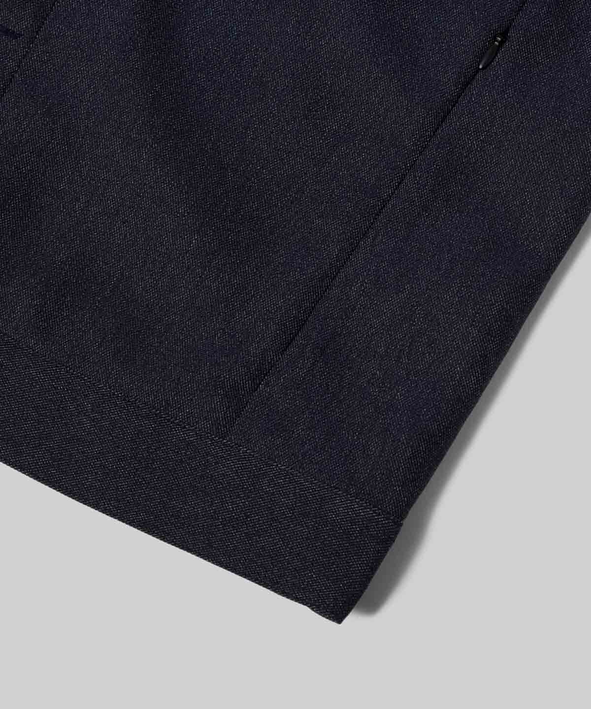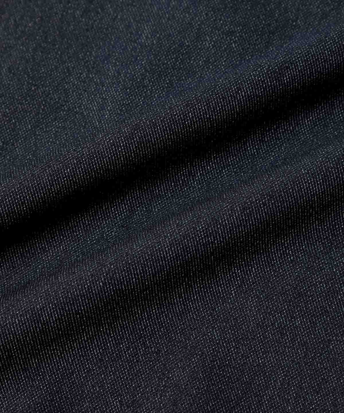 ポリエステル100%のデニムライク素材を使用した、ジャケット。通常のデニム素材はネイビー×白で形成されるところ、本素材にはネイビー×杢の糸が使用されている為、白場が和らぐ上品な印象を与える。