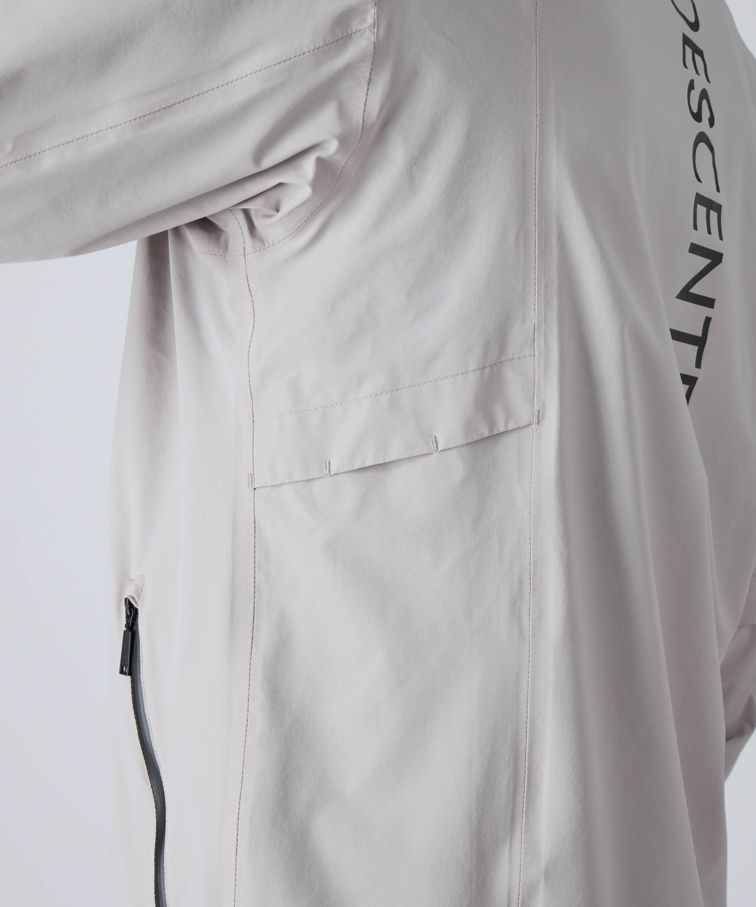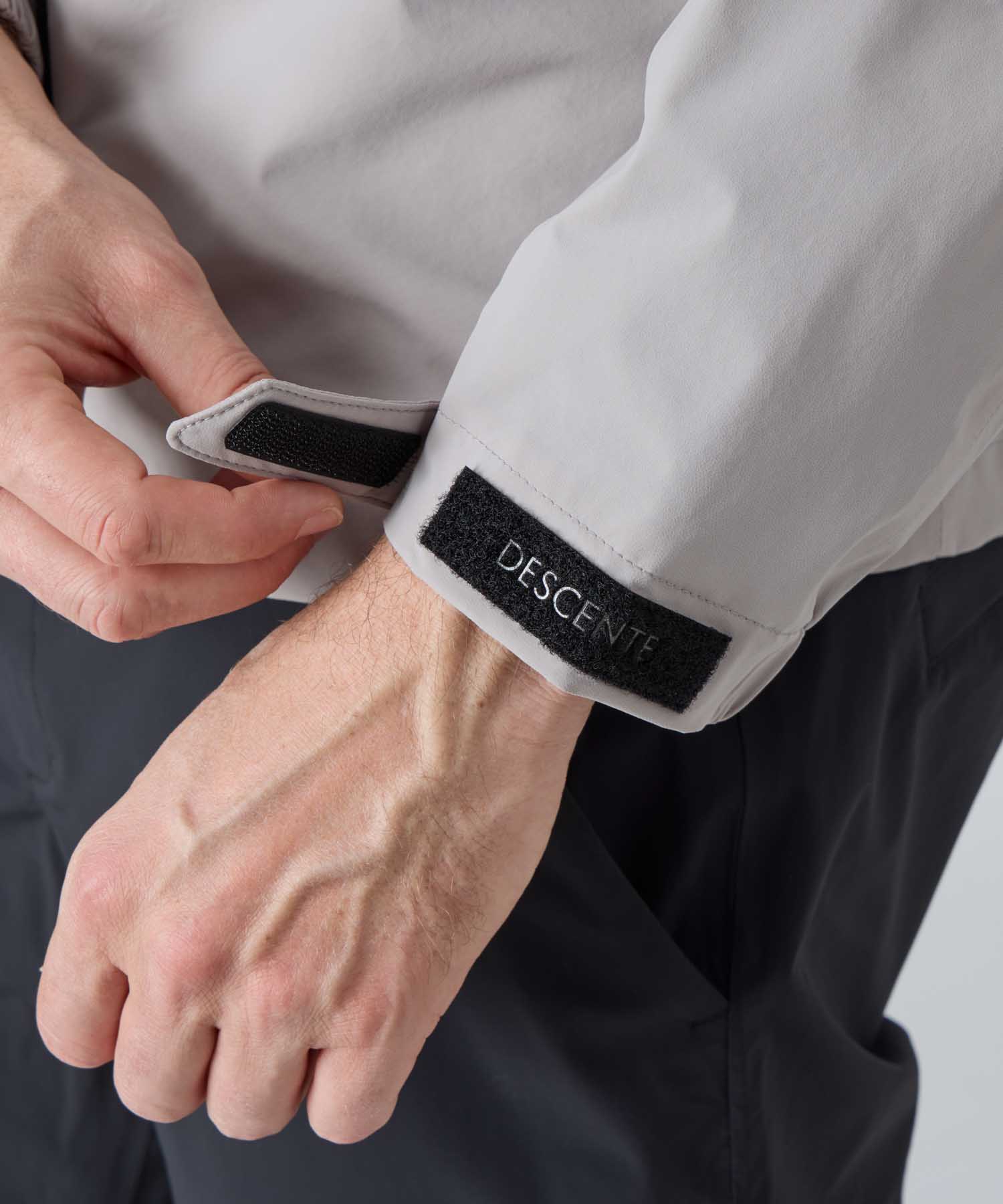 デサントロゴを配したアジャスター配置。アクティブな動きの中でも袖口のホールド感をキープ。