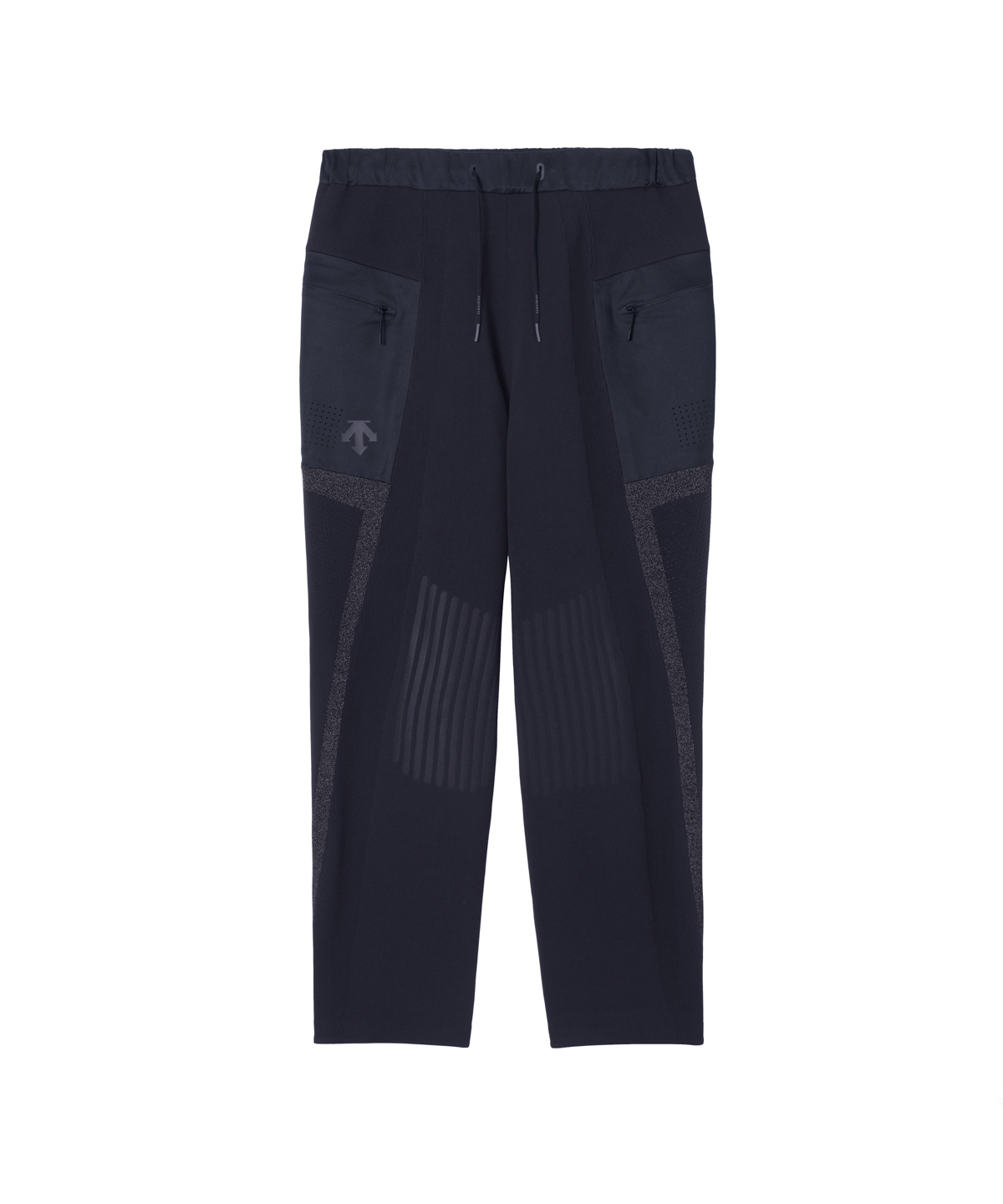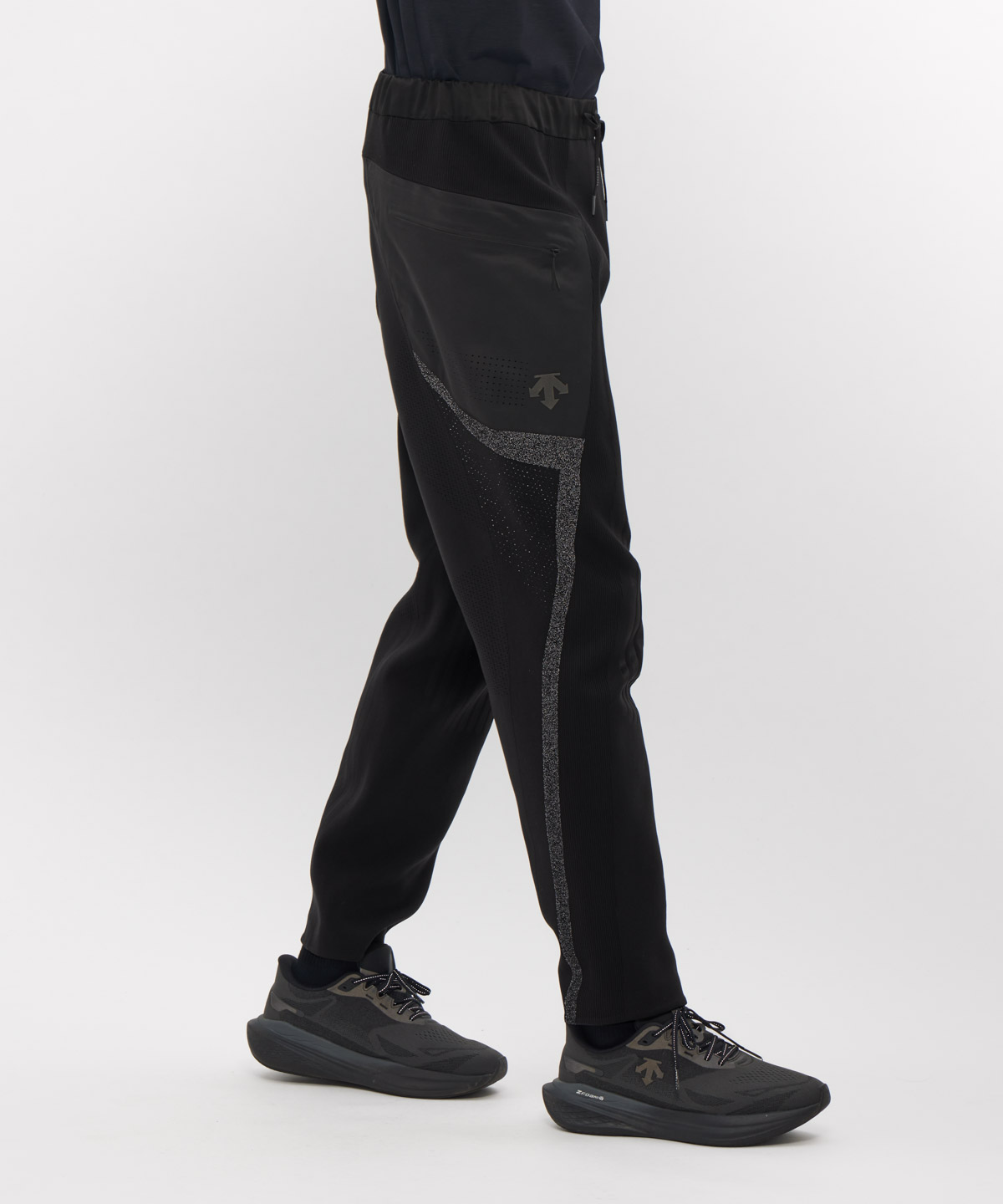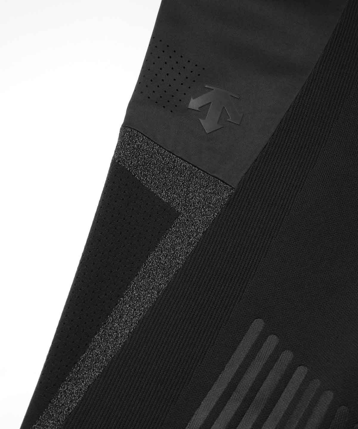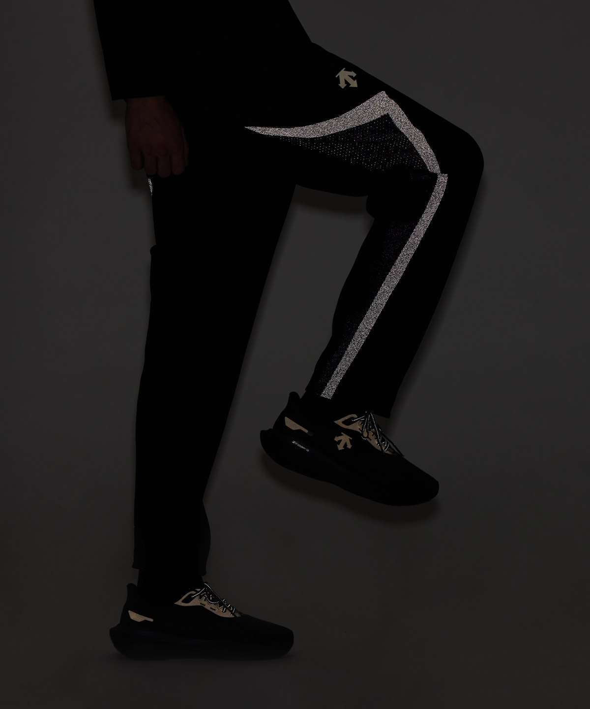 早朝や夜間に視認性を高めるリフレクターヤーンとリサイクルマテリアルを高度な技術で編み込んだ新開発のジャカードファブリック。上質なニットの風合いを持ちながら、体を包む安心感と品位あるシルエットは、デサントのパターン技術と接着縫製技術によって形作られる。デサント独自のスウェットマッピング理論に基づき、発汗量が多い箇所にメッシュ構造の生地組織変化を施し、適度な通気性を実現。1枚の生地の中で部位ごとに機能変化をもたせる独自の素材開発技術「Schematech(R)/スキーマテック」を用いて表現。膝部分はトレーニング時の負荷を考慮し特殊なエンボス加工を施す。両サイドにファスナーポケットを配置。ウエスト外出しの紐でサイズ調節が可能。