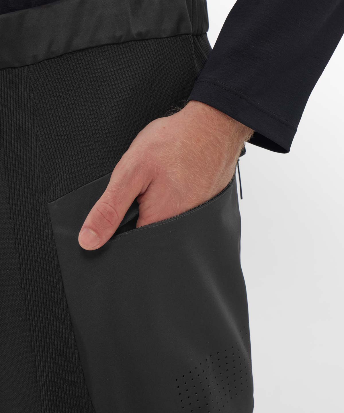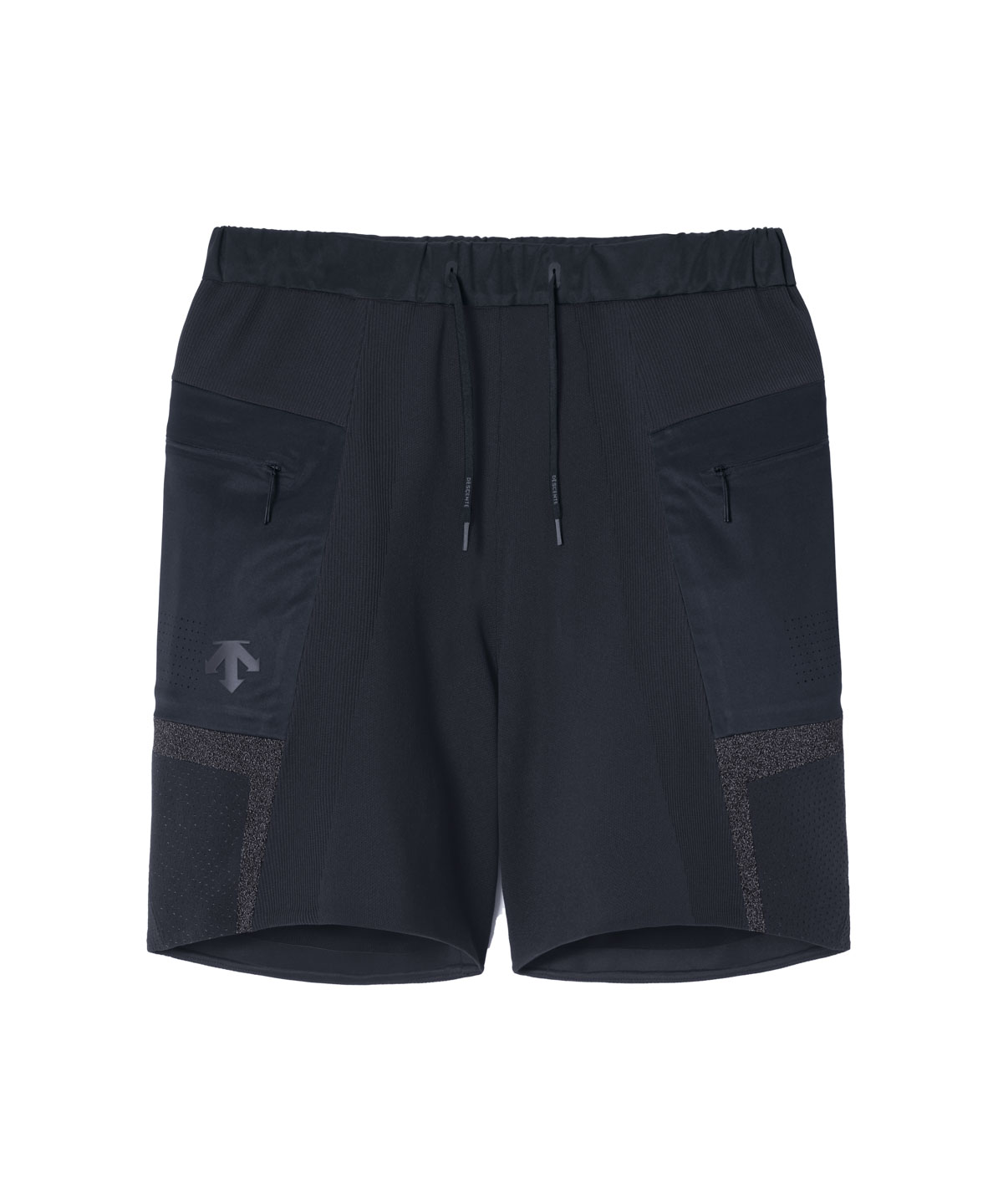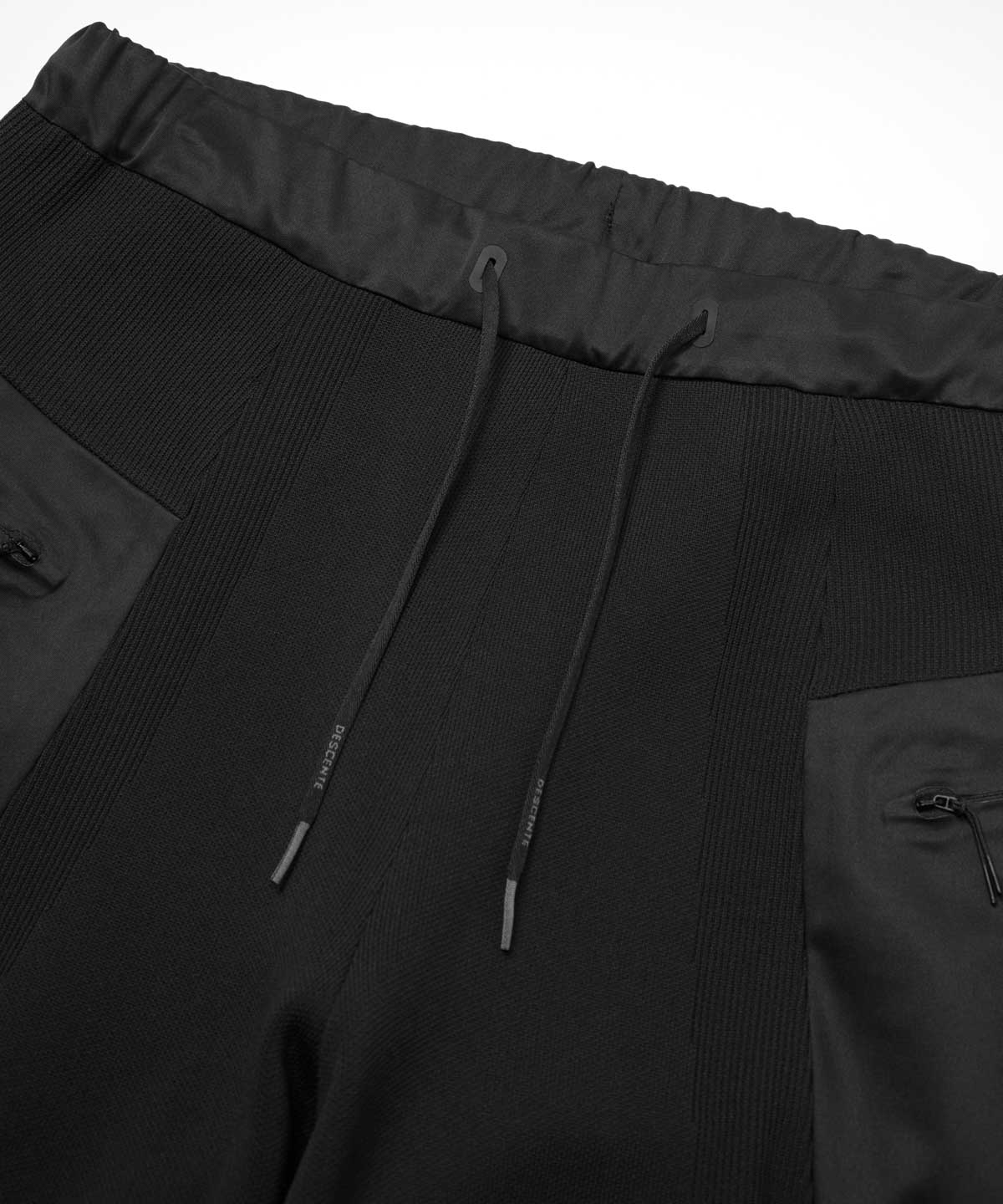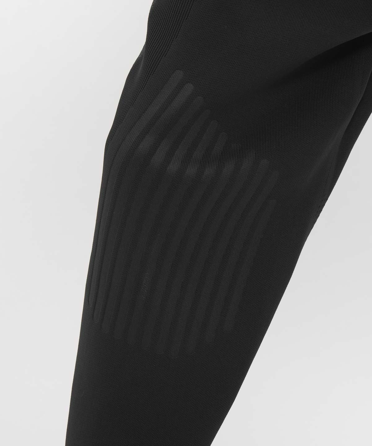 早朝や夜間に視認性を高めるリフレクターヤーンとリサイクルマテリアルを高度な技術で編み込んだ新開発のジャカードファブリック。上質なニットの風合いを持ちながら、体を包む安心感と品位あるシルエットは、デサントのパターン技術と接着縫製技術によって形作られる。デサント独自のスウェットマッピング理論に基づき、発汗量が多い箇所にメッシュ構造の生地組織変化を施し、適度な通気性を実現。1枚の生地の中で部位ごとに機能変化をもたせる独自の素材開発技術「Schematech(R)/スキーマテック」を用いて表現。膝部分はトレーニング時の負荷を考慮し特殊なエンボス加工を施す。両サイドにファスナーポケットを配置。ウエスト外出しの紐でサイズ調節が可能。