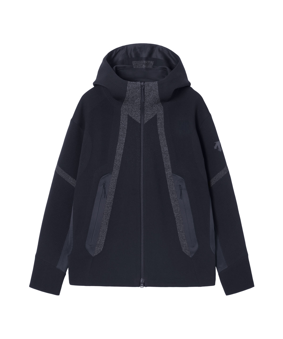- 上質なニットの風合いを持ちながら、体を包む安心感と品位あるシルエットは、デサントのパターン技術と接着縫製技術によって形作られる。