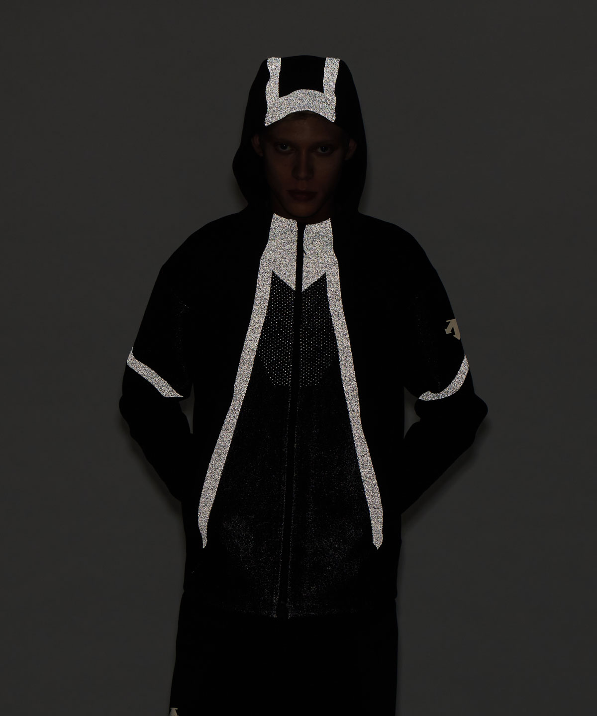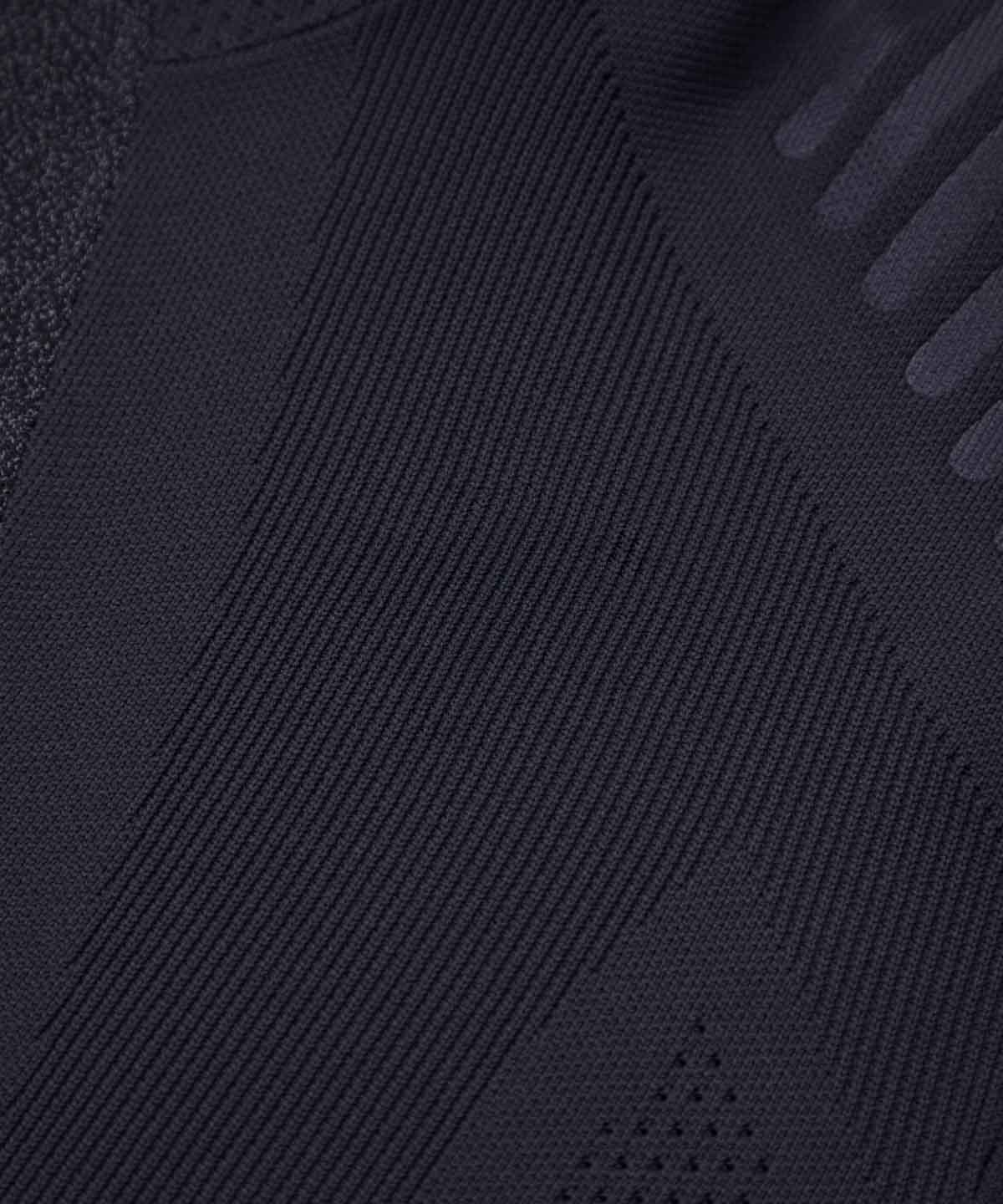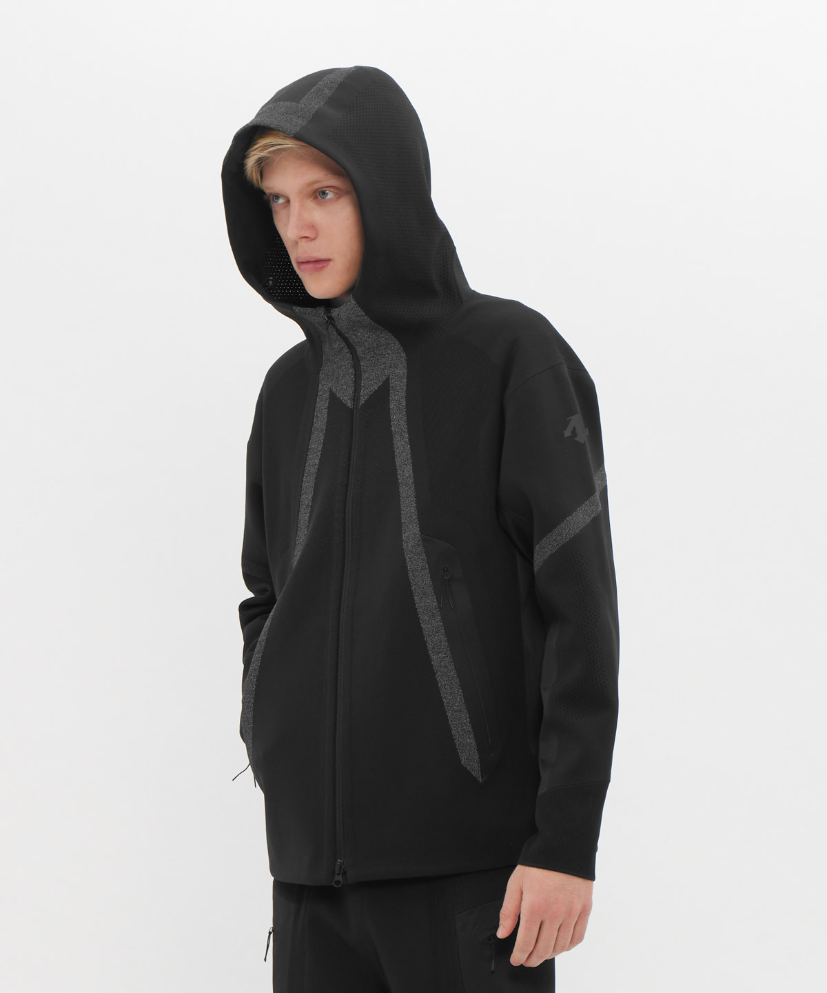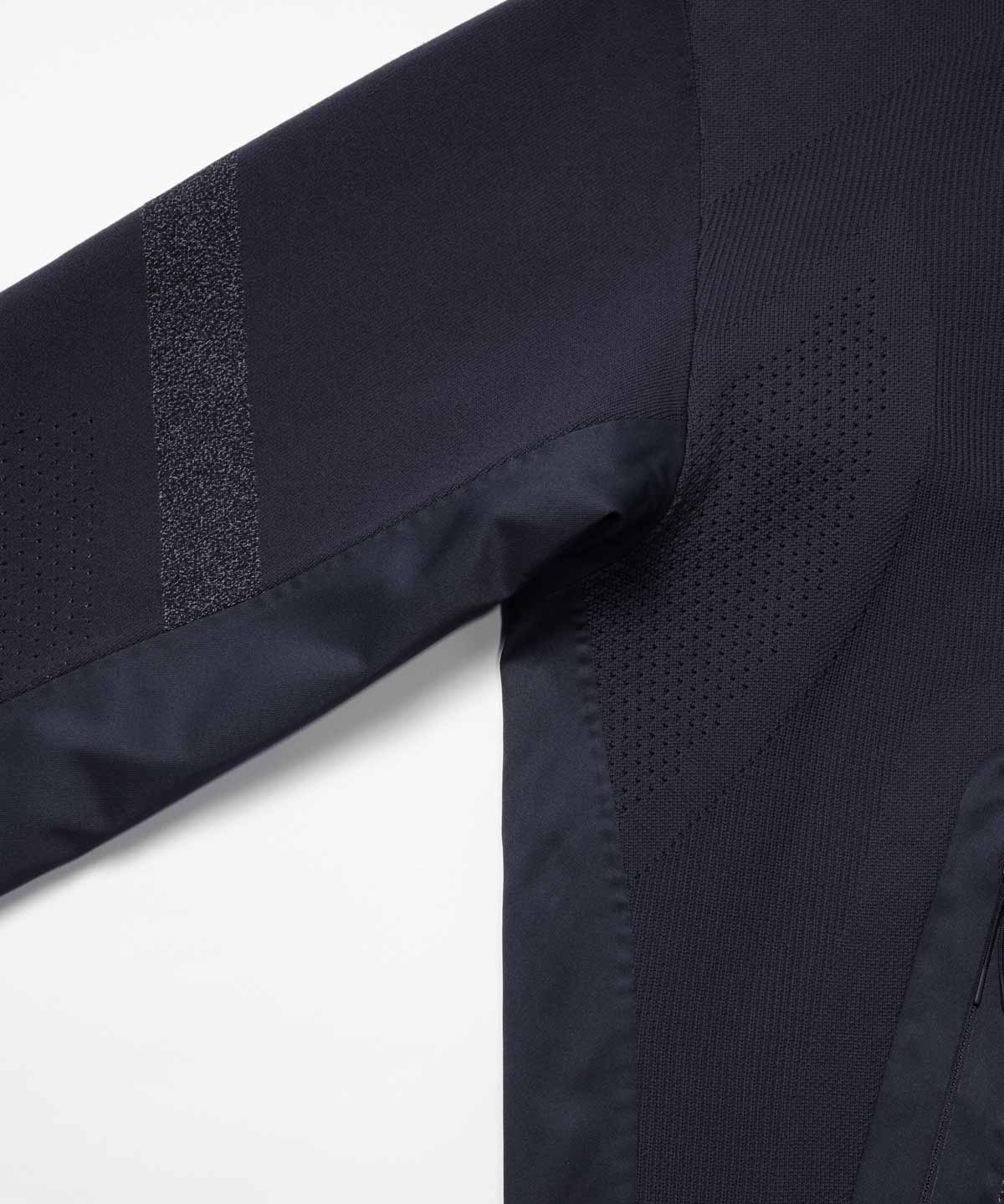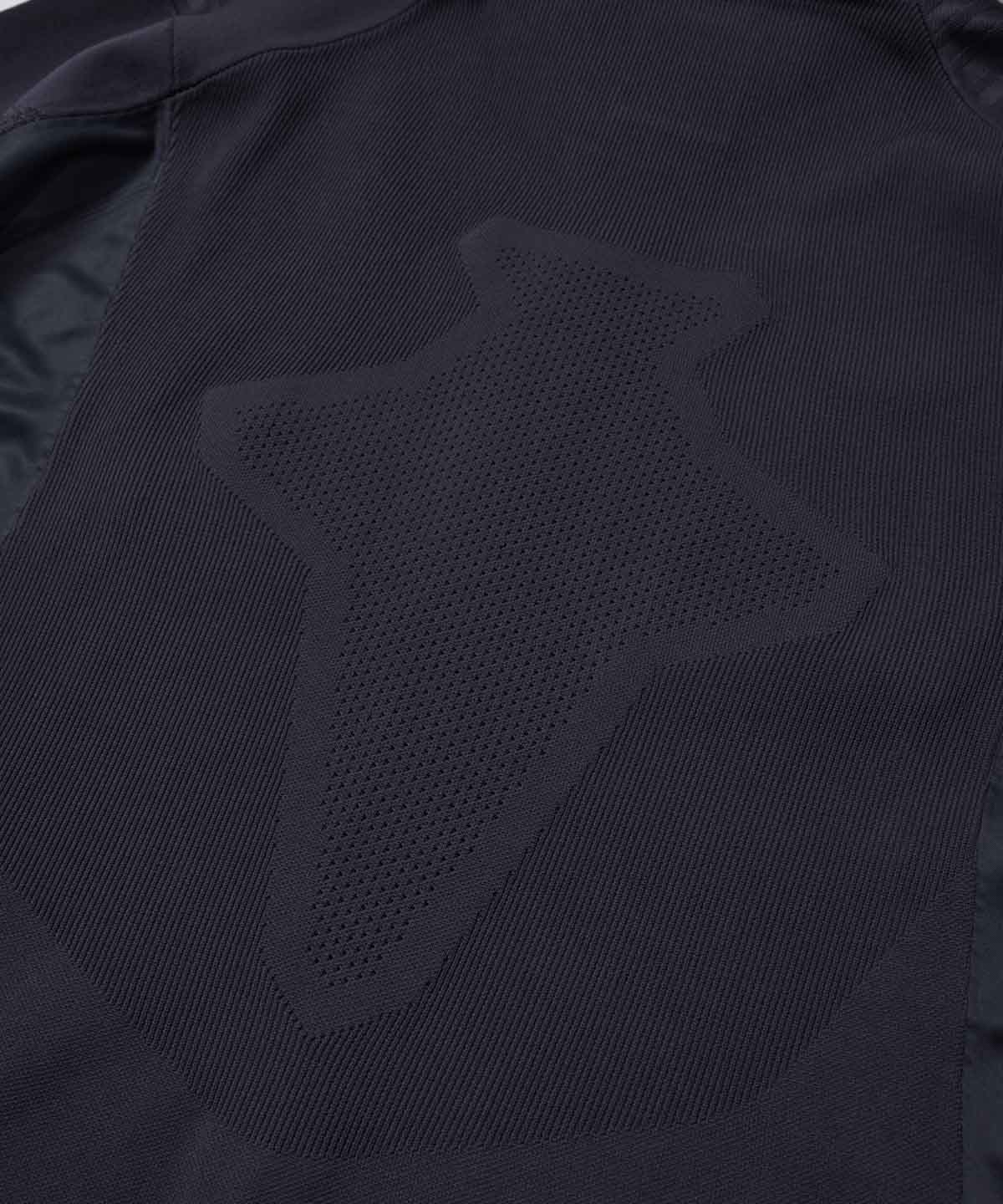 上質なニットの風合いを持ちながら、体を包む安心感と品位あるシルエットは、デサントのパターン技術と接着縫製技術によって形作られる。早朝や夜間に視認性を高めるリフレクターヤーンとリサイクルマテリアルを高度な技術で編み込んだ新開発のジャカードファブリック。デサント独自のスウェットマッピング理論に基づき、発汗量が多い箇所にメッシュ構造の生地組織変化とアイレットベンチレーションを施し、適度な通気性を実現。1枚の生地の中で部位ごとに機能変化をもたせる独自の素材開発技術「Schematech(R)/スキーマテック」を用いて表現。トレーニング時の腕振りの擦れを考慮し、袖下から脇身頃にかけてウーブン素材を切替え使用。
