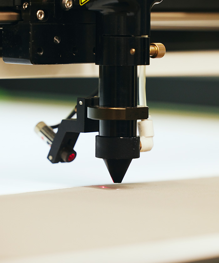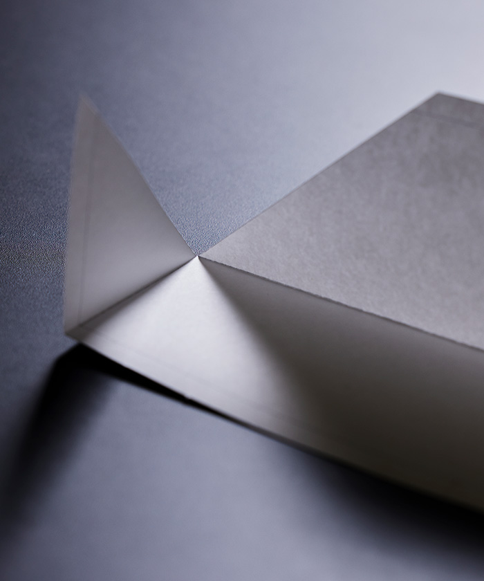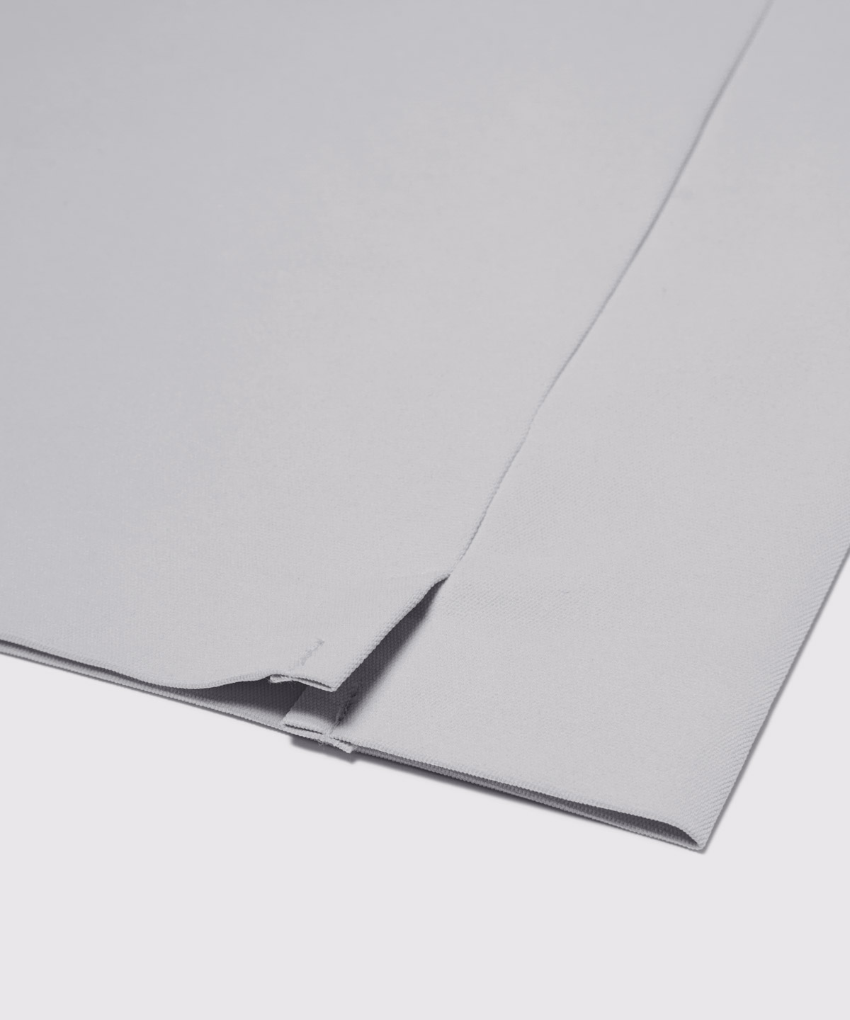 接着襟の弱点を解決した「襟を折り、接着する」という技術。従来のスマートな襟に用いられていたレーザー裁断と接着縫製には、裁断部の焦げ付きや、変色が発生。ORI-ERIは折ってから接着する為、襟端の焦げつきもなく、白色の展開も可能。
