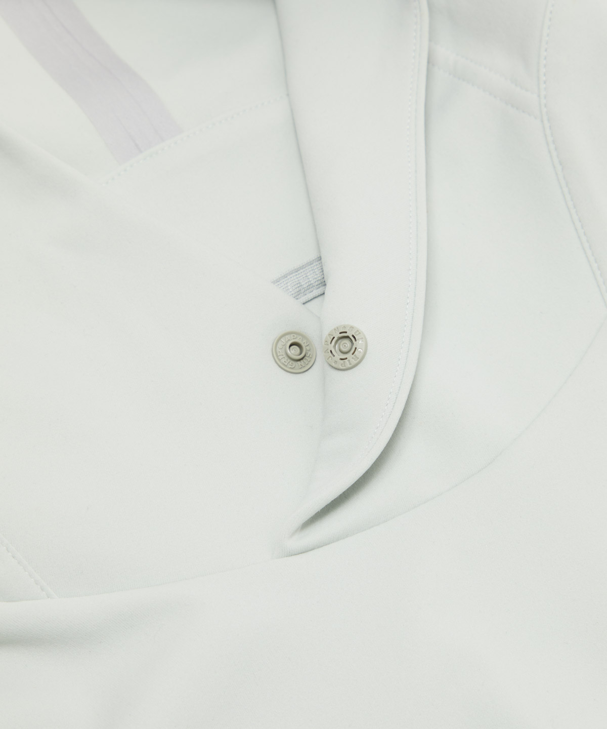 フラットで上品な表情をした生地は、ウーブン素材で使用するような30デニールの細番手の糸に対して、1本1本緻密に撚りをかけることでバネのような強靭な捲縮性をもたせ、がっちりと目の詰まったハイゲージで編みこむことで、ヘビーウェイトのような見た目から想像できないような軽やかでドライタッチな着心地を実現。縦横に伸びる2WAYストレッチ性と吸水性、UPF50+のUVカット性能を併せ持った機能性素材は、和歌山の生地パートナーと共に開発したDESCENTEのオリジナルファブリック。