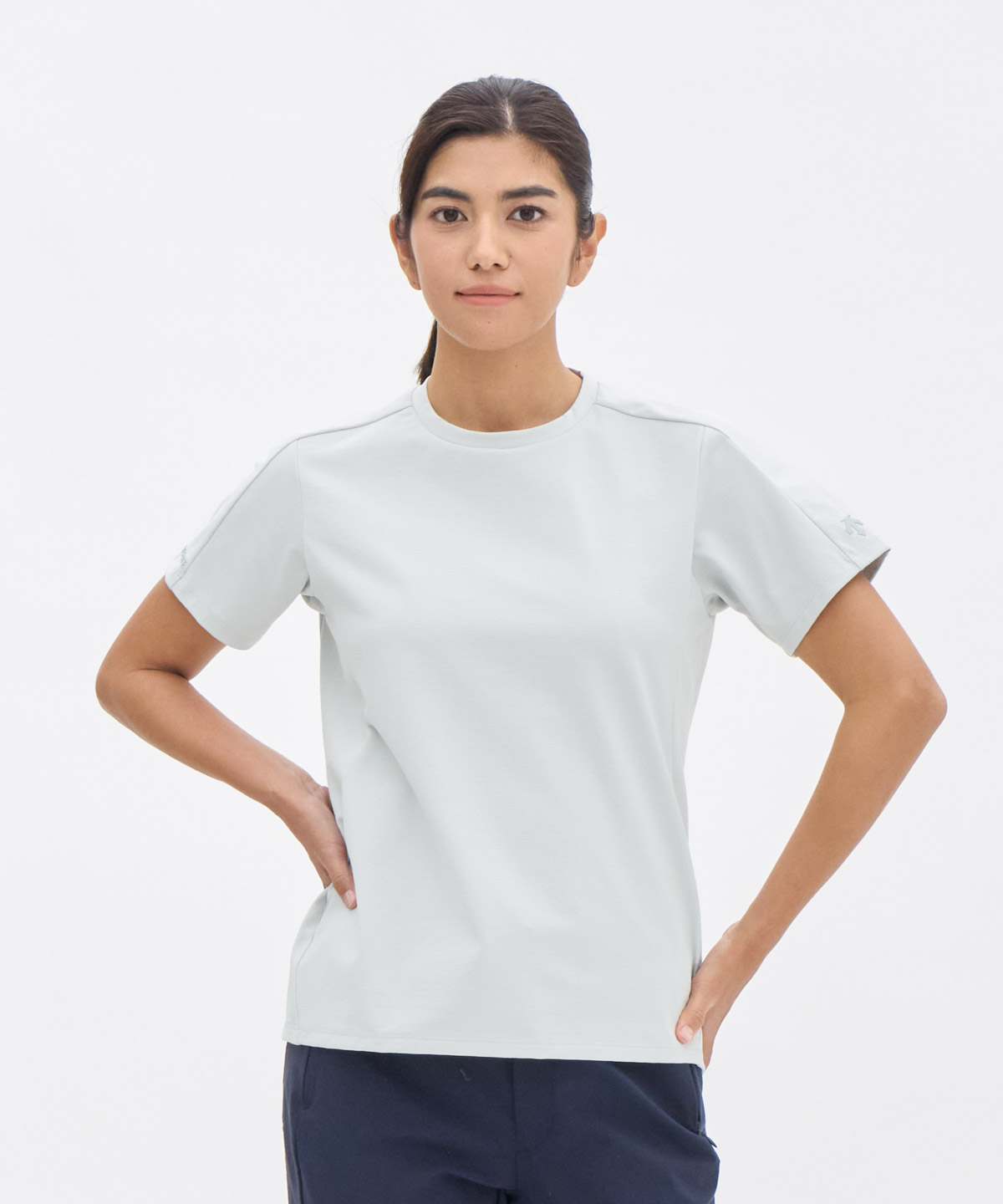 しなやかで軽く、ストレッチ性に優れた生地を使用しているため、いつでも着ていたくなるようなやわらかさと心地よい肌触り。特殊糸によってできる優れた吸水速乾性によるドライ感が特徴で、スポーツ時の汗による不快感を軽減。