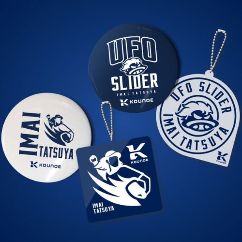 今井選手のロゴがデザインされた缶バッジ・キーリングの中から、ランダムでお届けします。