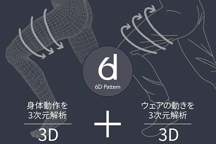 身体の3D × ウェアの3D 「身体の動き」と「ウェアの動き」をあらゆる角度から分析し、2つのデータを掛け合わせて生まれた6D Pattern(シックスディー パターン)。独自開発のこの技術で体への負担を軽減。ストレスフリーな着心地を実現しました。「無意識」という、究極の贅沢を体感できるパンツの誕生。
