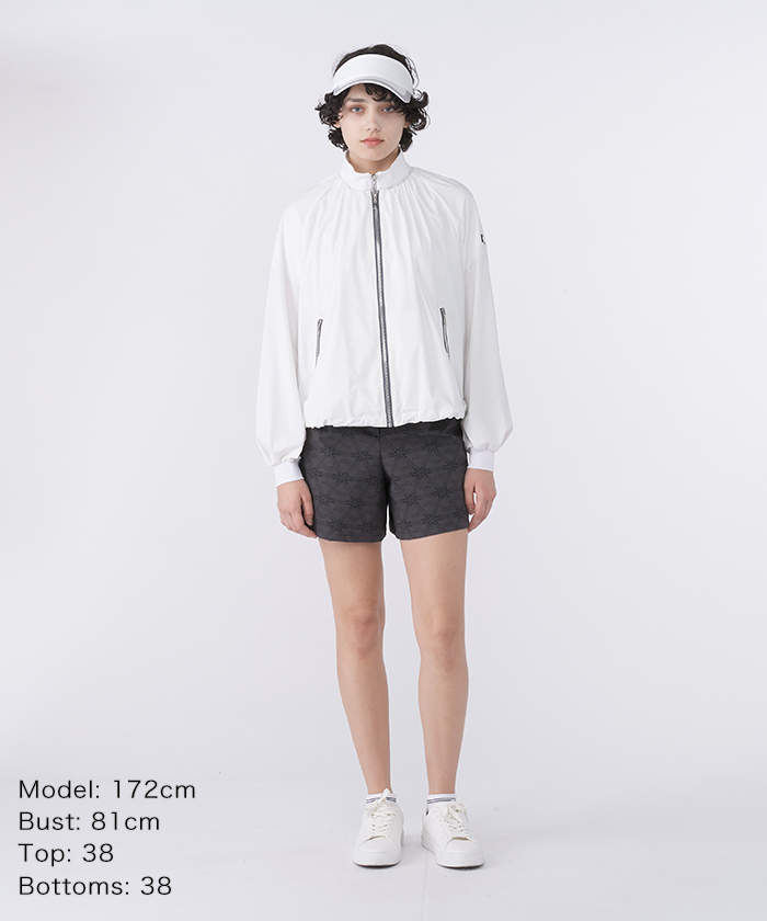 トップスは、衿元から裾にかけてや、袖口のギャザーの膨らみ感が女性らしい、裏地のないノーカラーブルゾンです。