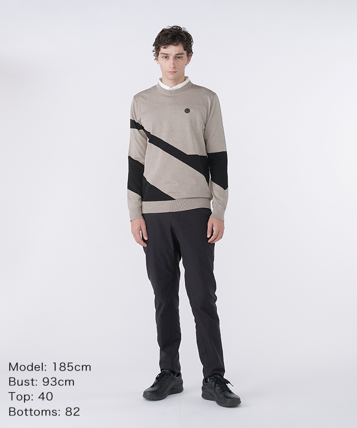 トップスのセーターは、全体に広がるオリジナルの幾何学柄を、上品かつモダンな配色で表現しました。