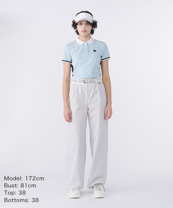 トップスの半袖ポロシャツは、衿と袖口のリブにはさりげなくラメ糸を織り込み、上品な輝きをプラスしました。