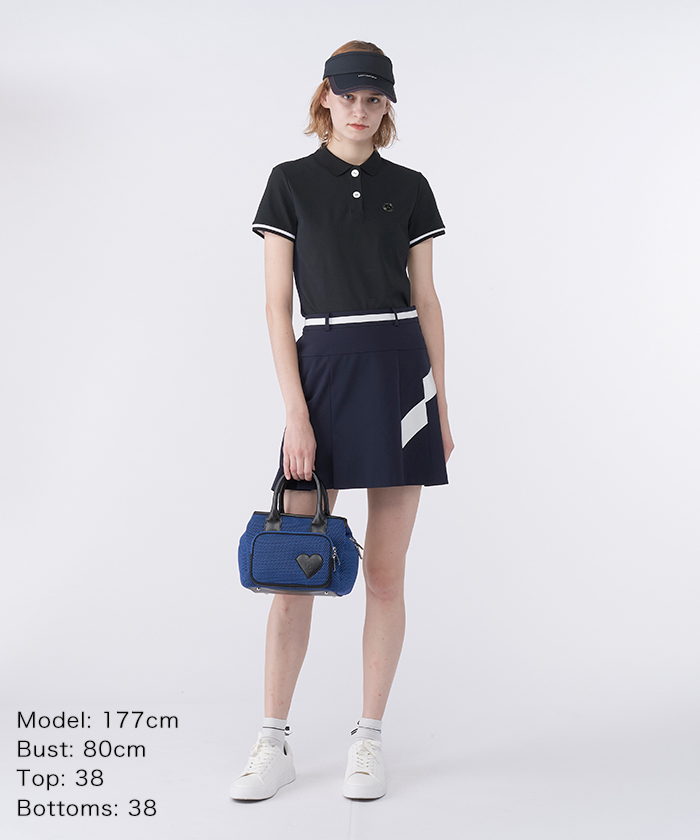 トップスの半袖ポロシャツは、衿と袖口のリブにはさりげなくラメ糸を織り込み、上品な輝きをプラスしました。