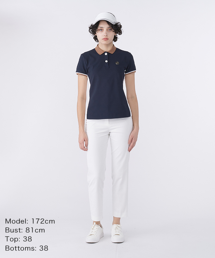 トップスの半袖ポロシャツは、衿と袖口のリブにはさりげなくラメ糸を織り込み、上品な輝きをプラスしました。