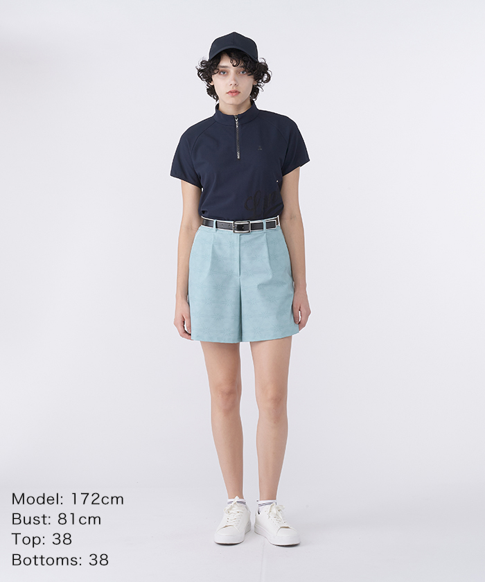 トップスのハーフジップ半袖シャツは、シーズンモチーフの手描きロゴを、まるでブラシで描いたような特殊な刺繍で表現しました。
