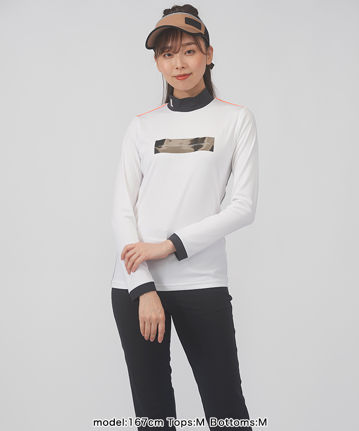 トップスは身頃と袖をカラーブロックしたデザインで、胸元にLANVINの5つのキーワードを表現したスクエアの箔転写ロゴプリントが、スポーティでモードな印象のロゴモックネック長袖シャツ。