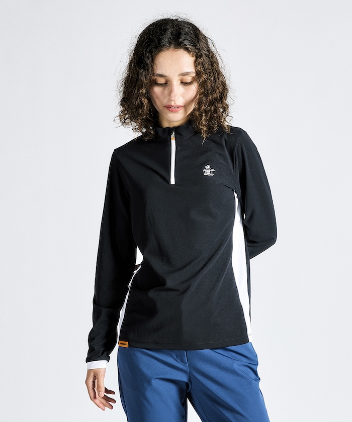 トップスは、バックに配した3種類のペンギンプリントがアクセントになったハーフジップシャツです。