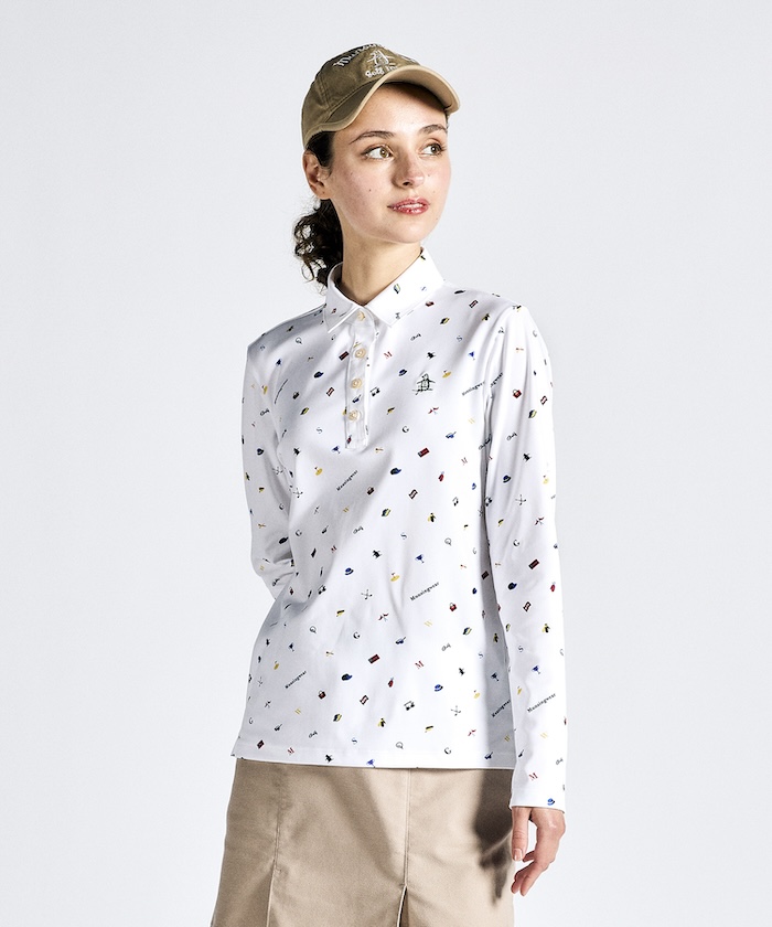トップスは、マルチカラーで表現したゴルフにまつわるデザインが可愛らしい長袖の台襟シャツです。