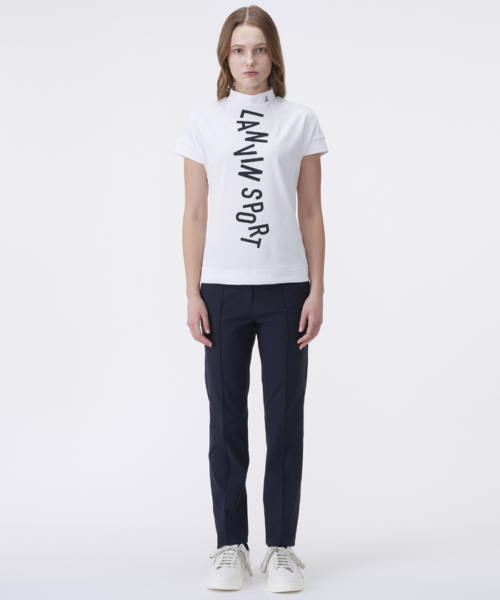 トップスの半袖シャツは、スポーティなデザインと快適な着心地が魅力の、フレンチスリーブシャツボトルネックのような首元にモックネックを組み合わせた、新鮮なデザインが特徴です。