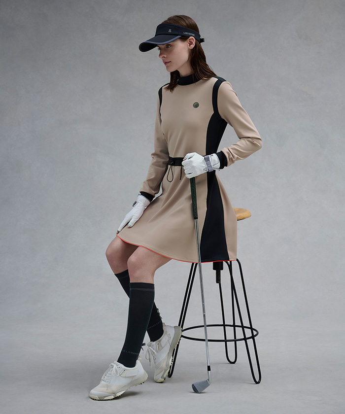 トップスは、カラーブロックが目を引くモックネックの長袖ワンピースです。