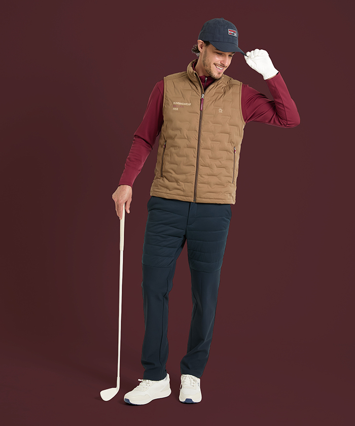 防風機能と蓄熱保温機能を備えた冬のゴルフに最適な中綿アウターベスト。