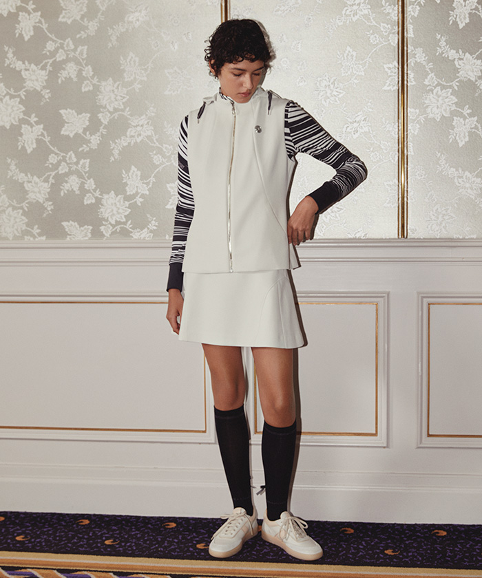 トップスのベストは、シャープな脇の斜め切り替えから繋がるボトルネックのようなスタンドカラーが特徴です。