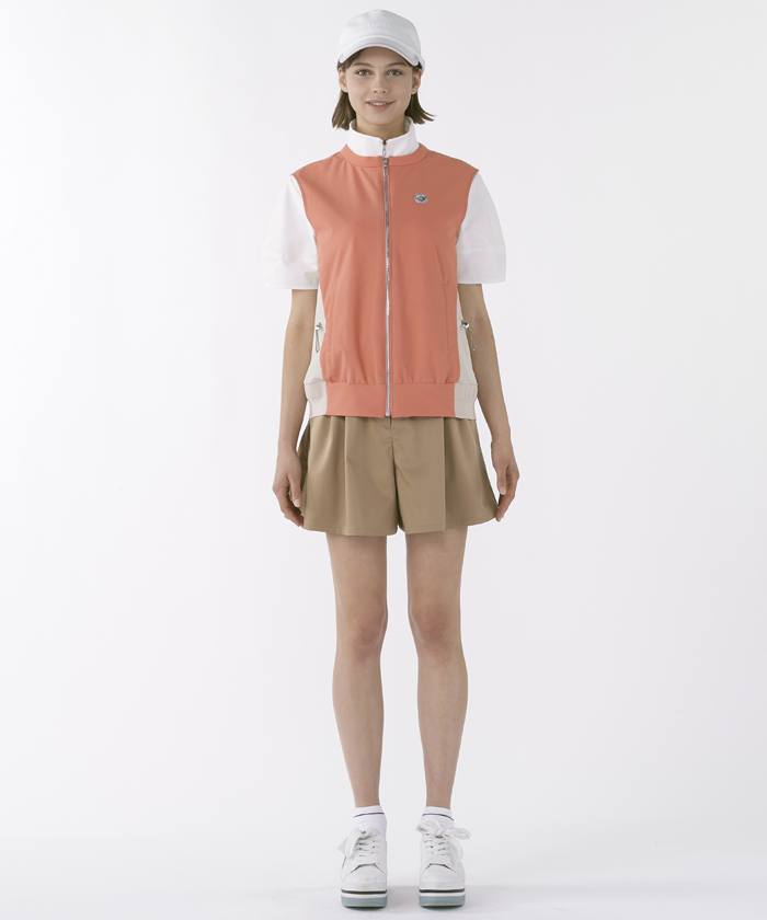 トップスのアウターベストの、前身頃には綿/ポリエステルのトリコット素材、前脇から後ろ身頃にはナイロンストレッチツイルをブロッキングで使用。