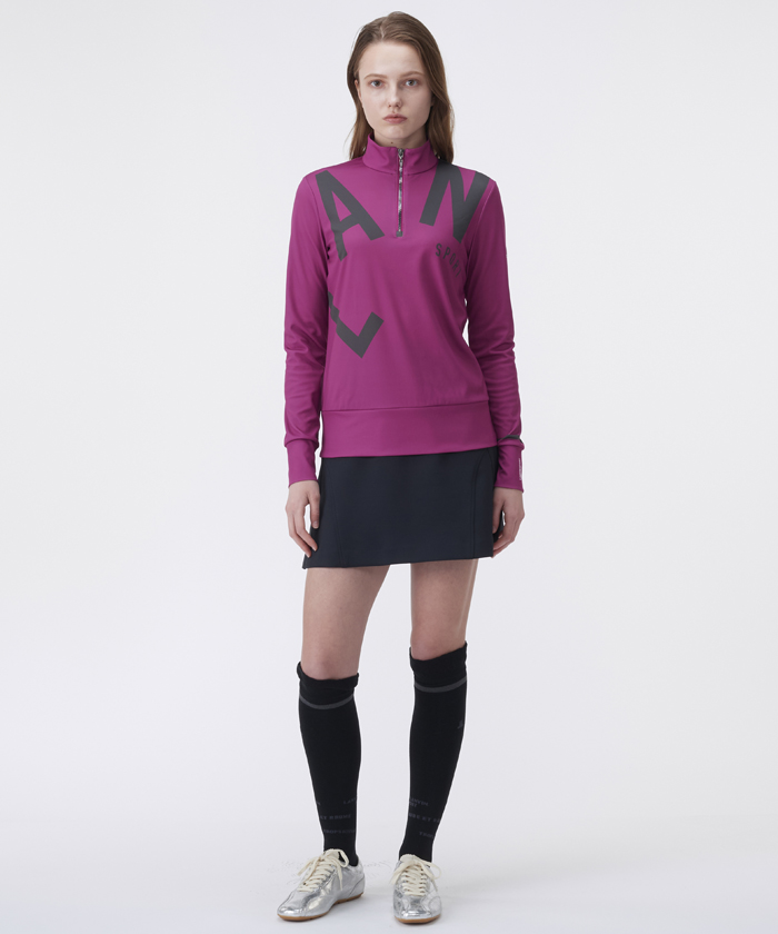 トップスの長袖シャツは、シャープな脇の斜め切り替えから繋がるボトルネックのようなスタンドカラーが特徴です。