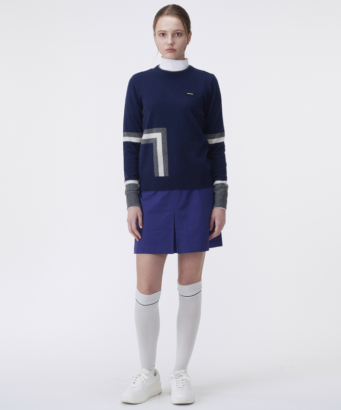 トップスのセーターは、今期のテーマを反映した幾何柄とボーダーラインをマルチカラーで構成。