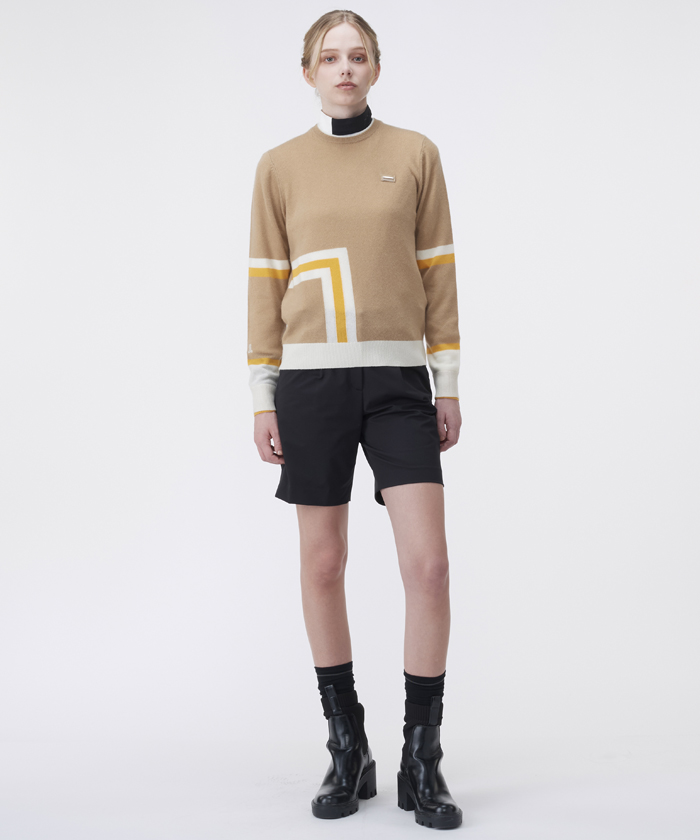 トップスのセーターは、今期のテーマを反映した幾何柄とボーダーラインをマルチカラーで構成。