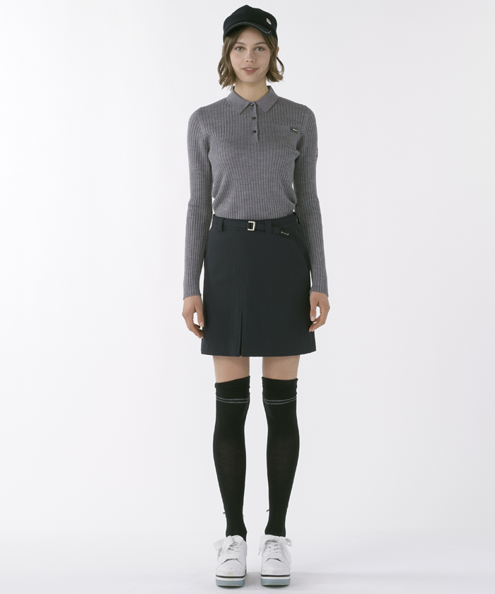 トップスの長袖ポロシャツは、4×3リブの編み地が豊かな表情と存在感を放つ、すっきりとしたポロ衿セーターです。