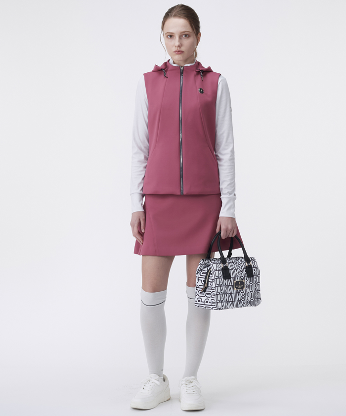 トップスのアウターベストは、シャープな脇の斜め切り替えから繋がるボトルネックのようなスタンドカラーが特徴です。