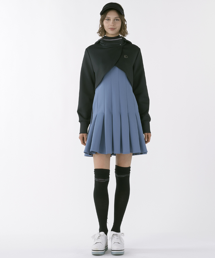 ワンピースは、生地の切り替えとそこから繋がるボックスタックのフレアが、女性らしい美しいシルエットを演出します。