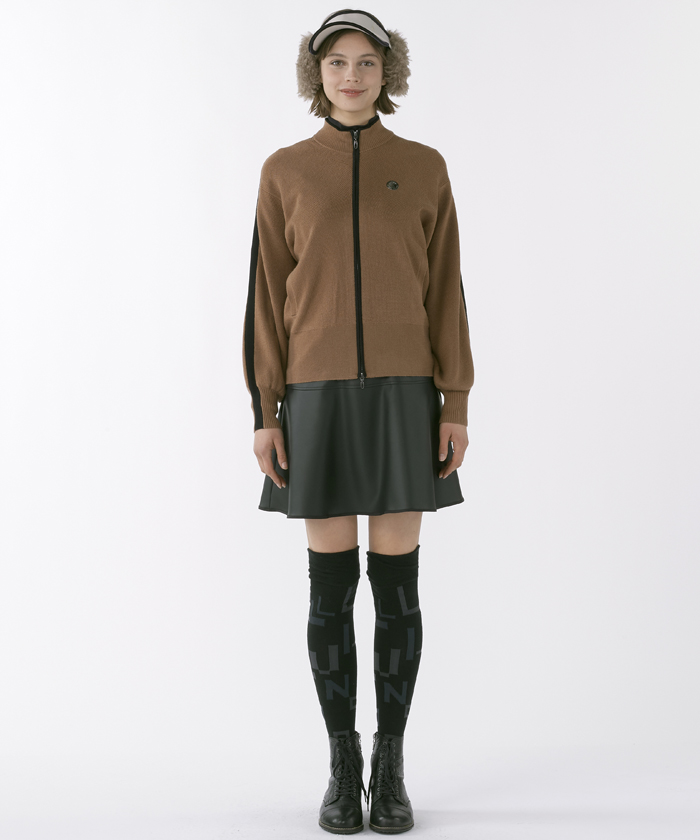 トップスのブルゾンは、畦とRIB編み地を組み合わせ、身頃部分にラウンドした動きのある編み地変化を演出。