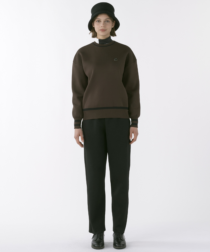 トップスは、表側にポリエステル糸、裏面にモール糸を使用したダブル組織のクルーネックセーターです。