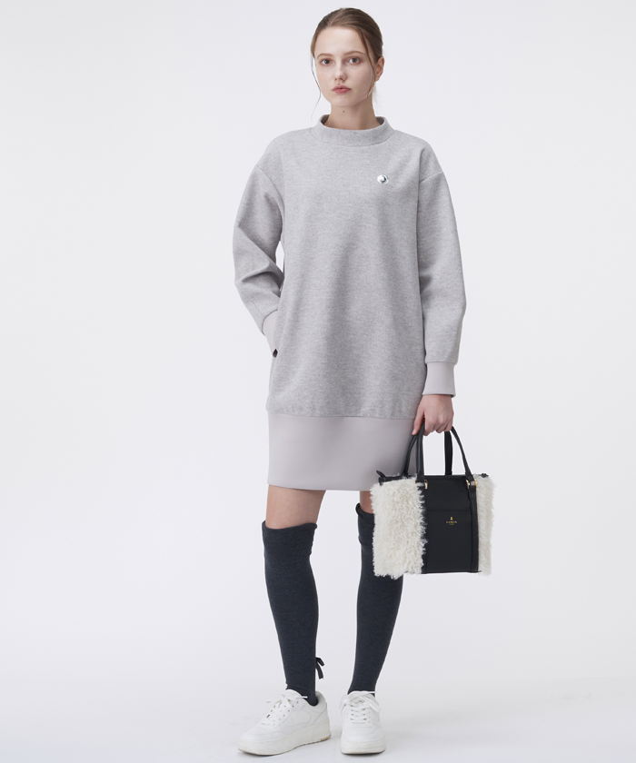 トップスは、温かみのある起毛ストレッチジャージを本体に、裾にはすっきりとしたダンボールカットソーを使用した異素材配色のハイネックワンピースです。