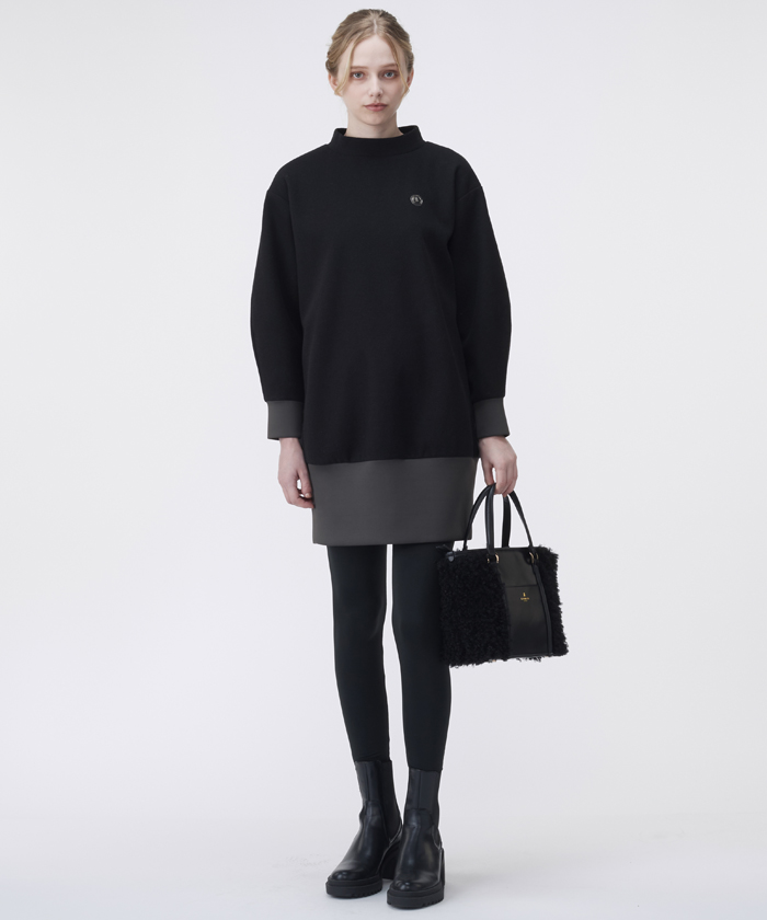 トップスは、温かみのある起毛ストレッチジャージを本体に、裾にはすっきりとしたダンボールカットソーを使用した異素材配色のハイネックワンピースです。