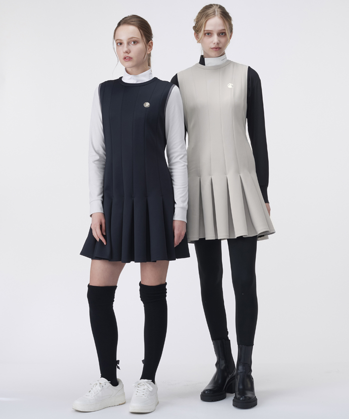 トップスのワンピースは、生地の切り替えとそこから繋がるボックスタックのフレアが、女性らしい美しいシルエットを演出します。