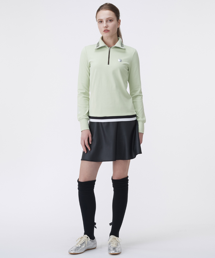 トップスのシャツは、衿端までファスナーを通したロールカラーが特徴です。