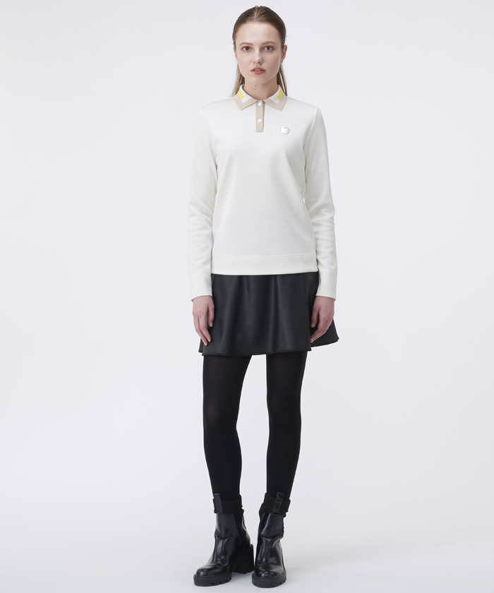 トップスは、ポップでグラフィカルなデザインが特徴のポロ衿長袖シャツです。