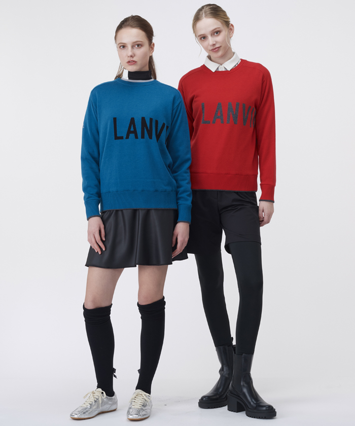 表のニットには今期のブランドロゴを大胆なインターシャで表現。
