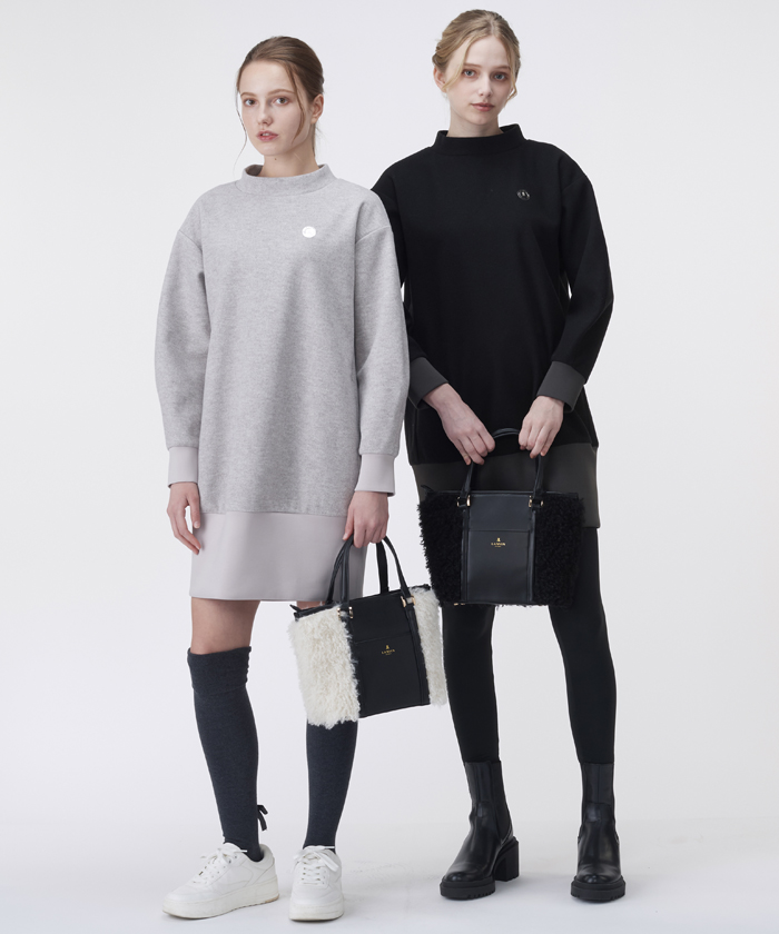 トップスは、温かみのある起毛ストレッチジャージを本体に、裾にはすっきりとしたダンボールカットソーを使用した異素材配色のハイネックワンピースです。