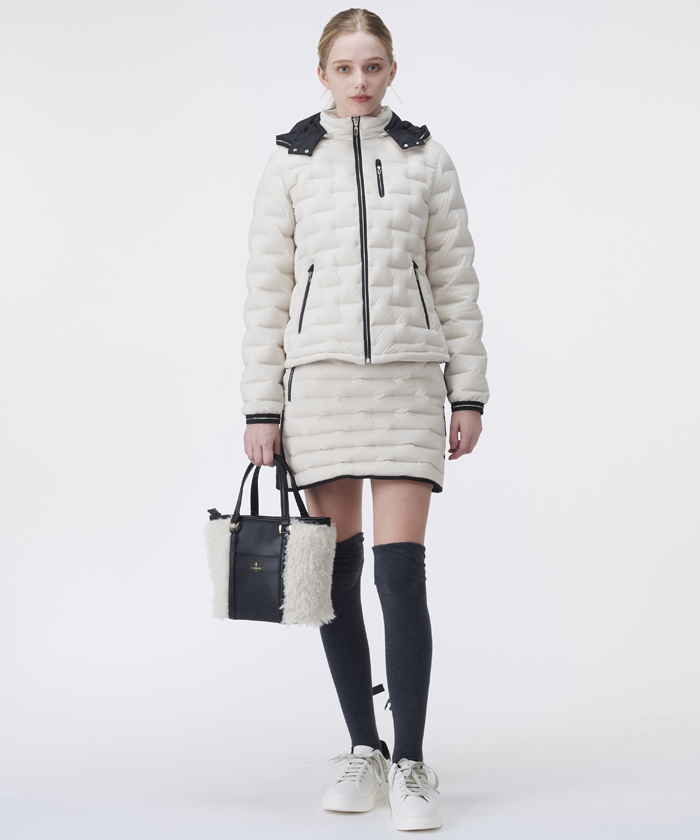 ボトムスは、前身頃にチューブダウン、後身頃に裏起毛ボンディング素材を配した異素材カラーブロックデザインの防寒スカートです。