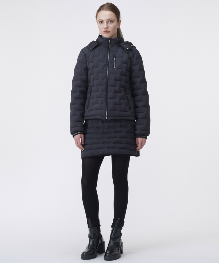 ボトムスは、前身頃にチューブダウン、後身頃に裏起毛ボンディング素材を配した異素材カラーブロックデザインの防寒スカートです。