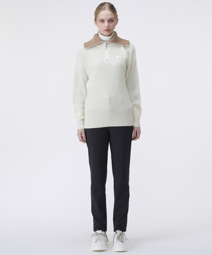 トップスのセーターは、衿端まで通したメタルファスナーと、配色を効かせた広めのロールカラーが特徴です。