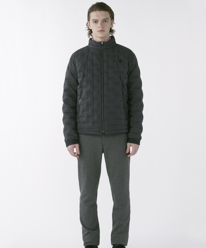 2枚仕立ての生地間に直接ダウンを吹き込む特殊な仕立てで、裏地やダウンパックが不要となり、すっきりとコンパクトなシルエットを実現。