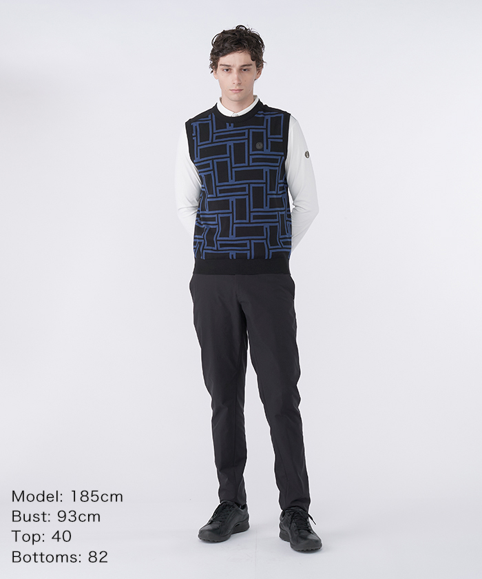 トップスは、ジャガードで表現された幾何学柄が印象的なクルーネックニットベストです。