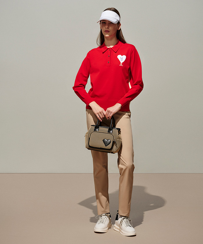 小物は、バイザーの後ろリボンとバッグのハート型アップリケでリンクさせ、大人の可愛らしさを細部に散りばめました。